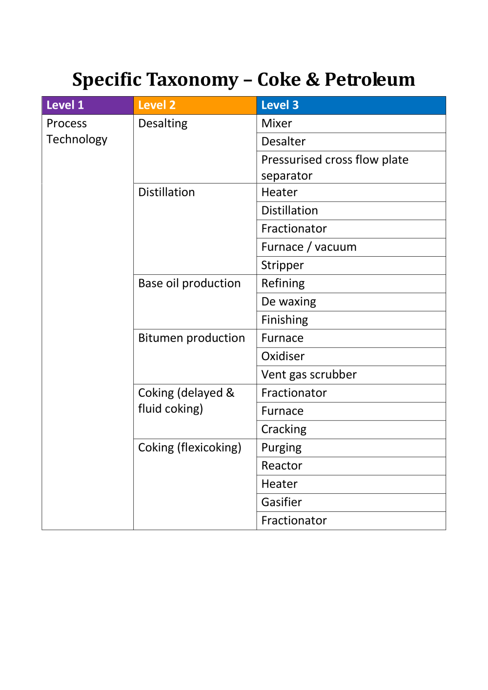 L3: the sub-phase of the process or the technology involved in the measure, both in general terms applicable to all sectors ("Generic taxonomy", e.g. "Heat recovery by heat exchanger") and in sector-specific terms ("Specific taxonomy", e.g. "Drying section").