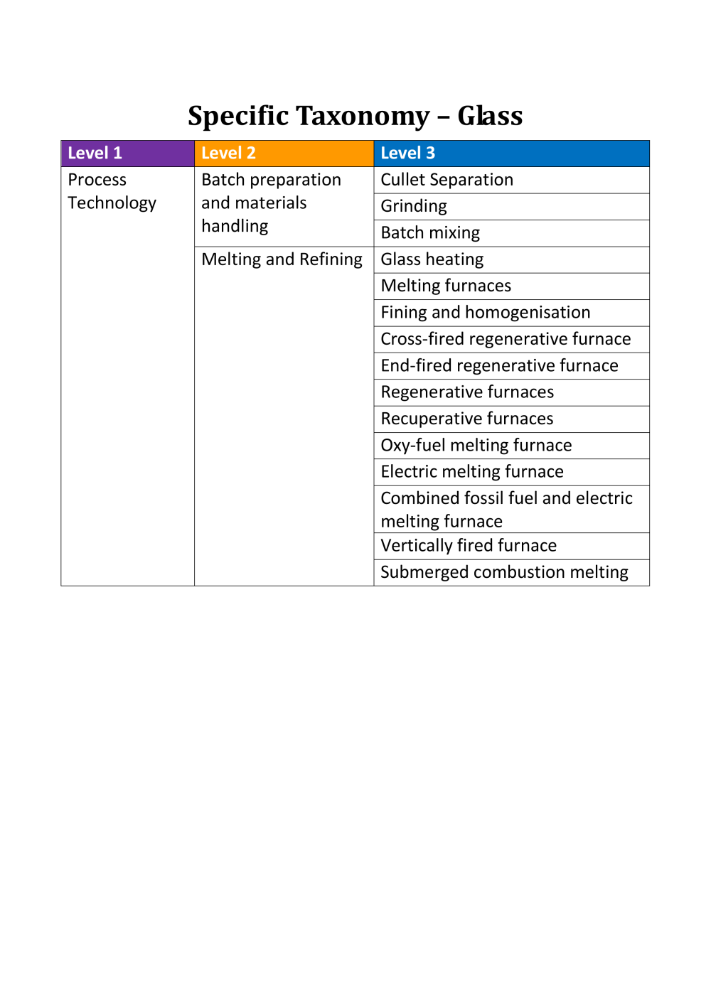 L3: the sub-phase of the process or the technology involved in the measure, both in general terms applicable to all sectors ("Generic taxonomy", e.g. "Heat recovery by heat exchanger") and in sector-specific terms ("Specific taxonomy", e.g. "Drying section").