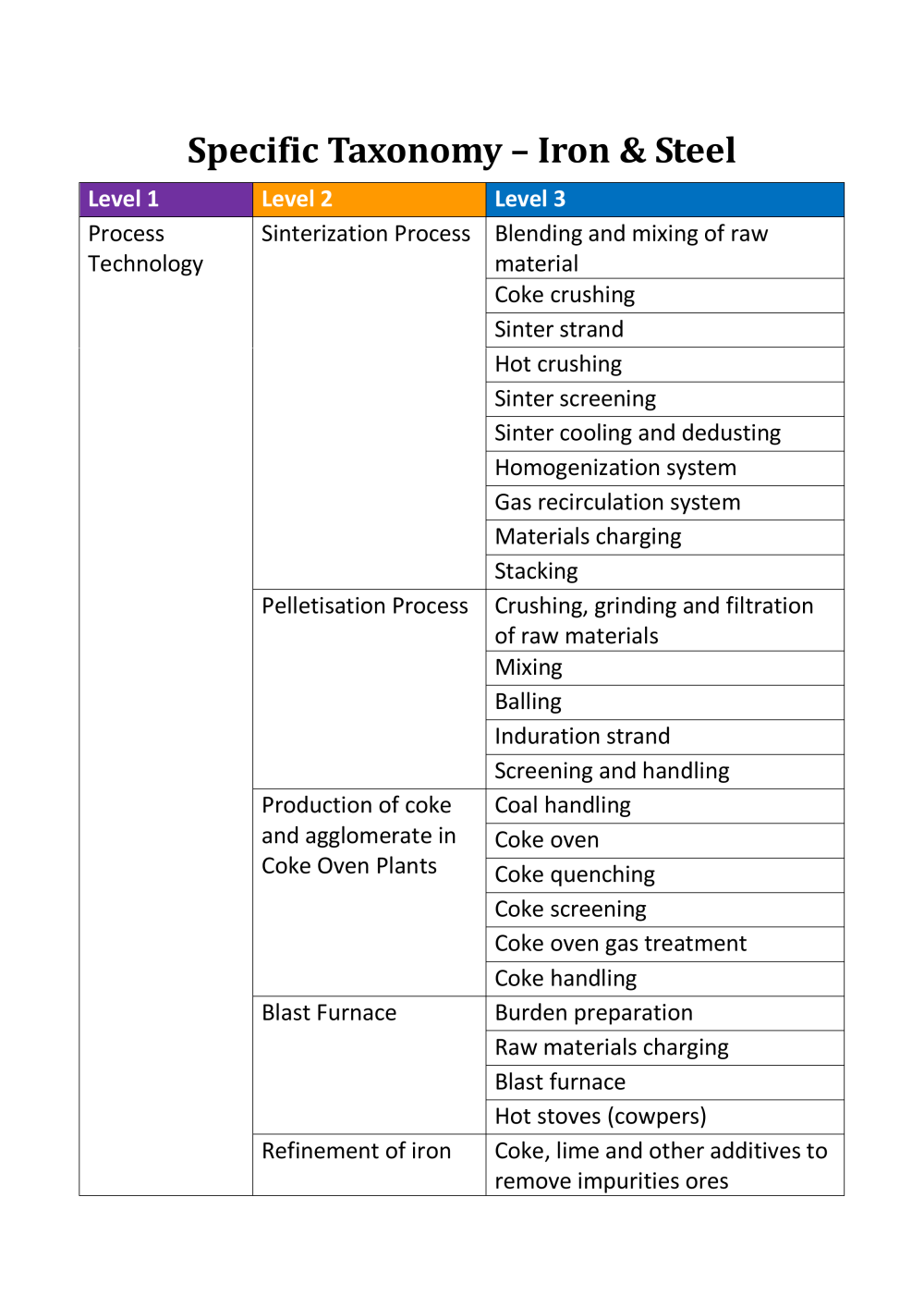 Taxonomy: it has been built in order to categorize the energy efficiency measures and enable a consistent comparison and the analysis of the different types of measures coming from the national data sets. The taxonomy gives a clear understanding of what component, process and system was affected by each individual measure described in the dataset. Two types of taxonomy have been developed: a generic taxonomy, which is not related to a specific sector and process and thus allow a basic categorization of the measures, and a specific taxonomy aimed at defining the production process and/or sub-process in each sector;